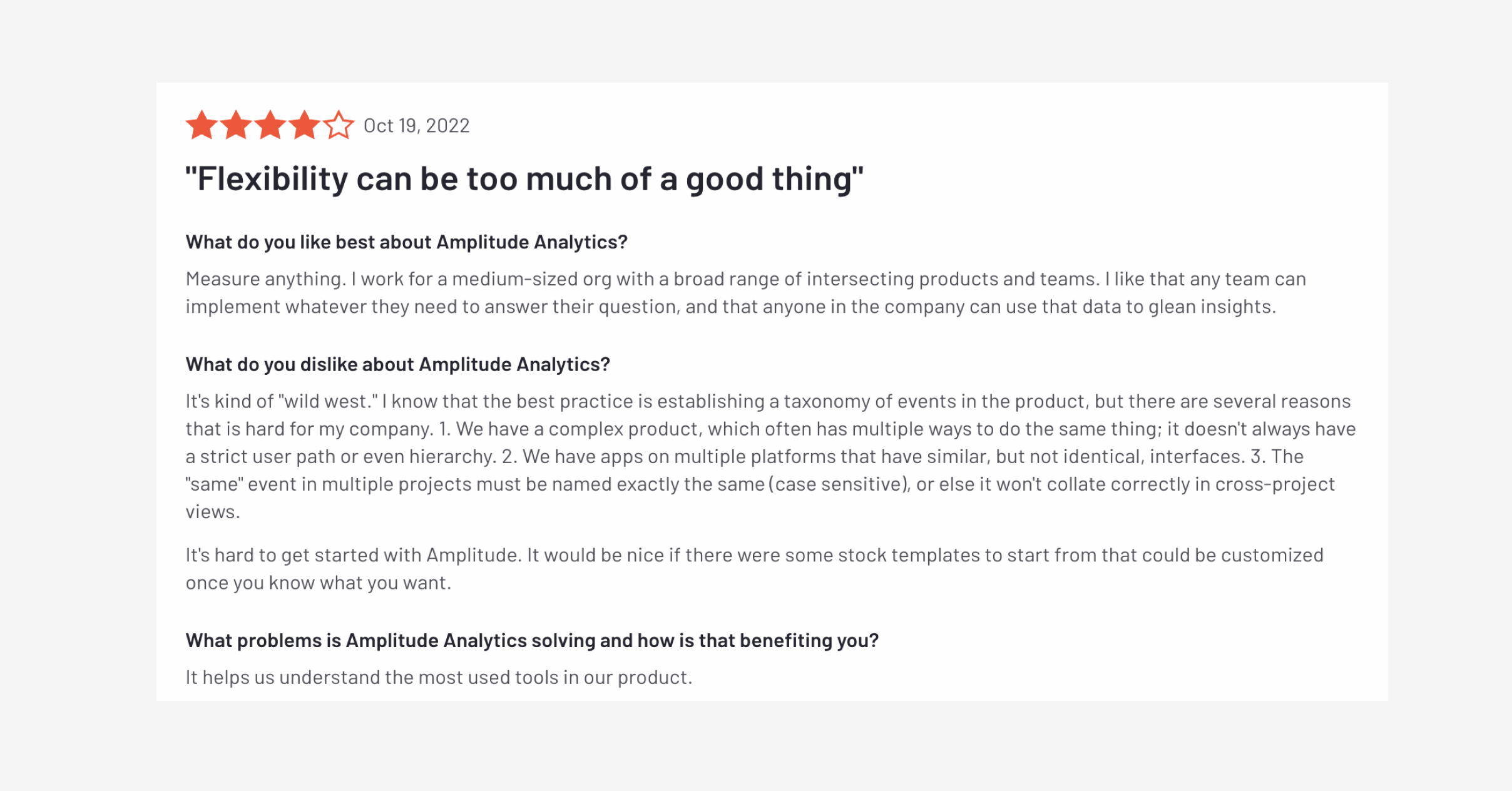 O Amplitude coloca uma grande ênfase na governança de dados e na instrumentação de eventos. Se você tiver uma forte equipe de dados com a capacidade de coordenar a configuração e a governança dos dados ao longo do tempo, o Amplitude será uma ótima solução.