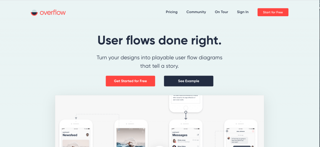 Overflow admite distintas integraciones, como Figma, Sketch, Jira, Trello, Photoshop y Adobe XD, para sincronizar tus diseños sin problemas. Su herramienta de diseño te permite conectar capas a pantallas, y puedes personalizar los conectores para que coincidan con la identidad de tu marca.