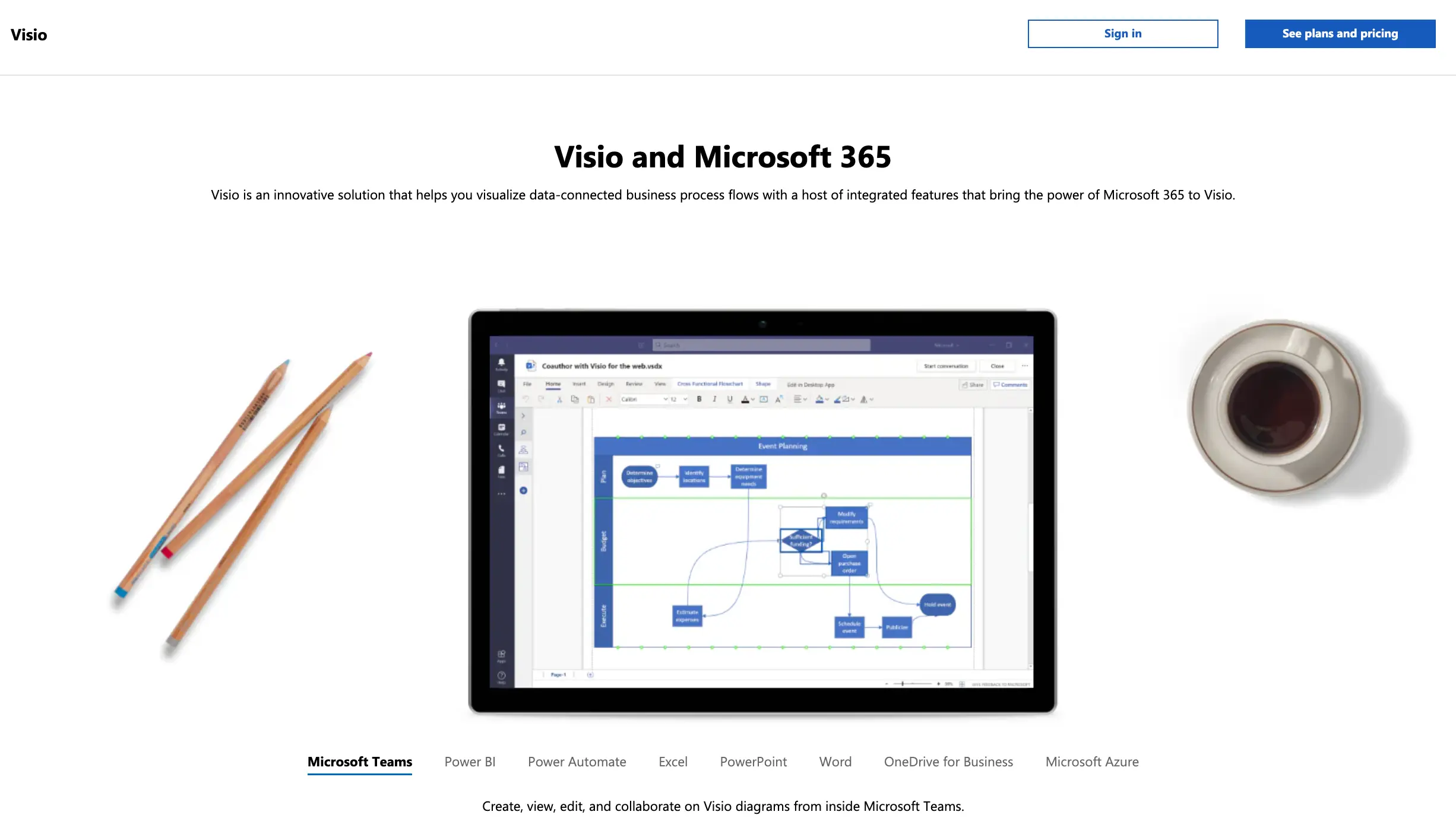Parte de la familia Microsoft Office, Visio es un creador de diagramas de flujo y software de diagramación. Te permite visualizar flujos de procesos empresariales conectados a datos y crear visuales fáciles de entender utilizando diagramas de inicio, plantillas prefabricadas y plantillas.