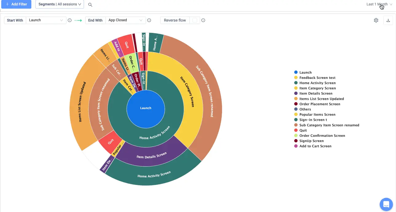 Aquí es donde la función Screen Flow y Screen Burst de UXCam resulta útil. Te permite ver de un vistazo los recorridos más utilizados por tus usuarios, lo que facilita el descubrimiento de recorridos alternativos que siguen los usuarios para alcanzar un determinado objetivo en tu aplicación.