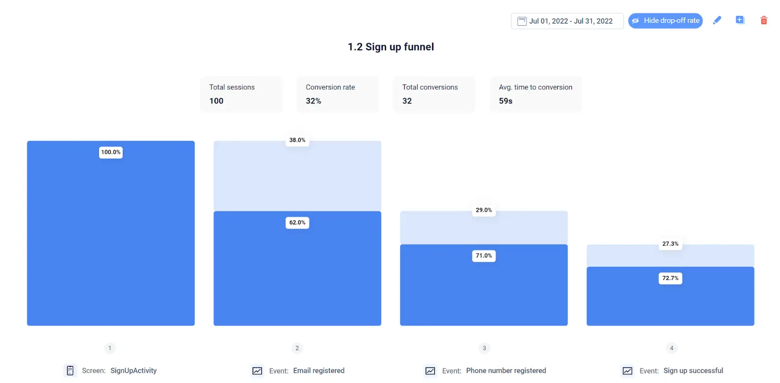 Análisis del embudo: Con sólo unos clics, puedes crear embudos y UXCam construirá automáticamente todos los pasos basándose en la ruta de navegación del usuario seleccionada. Esto hace que sea super sencillo hacer un seguimiento de tus embudos de conversión y determinar los pasos reales que siguen los usuarios para convertir en tu aplicación. Al utilizar datos para definir tus embudos, puedes eliminar cualquier sesgo y realizar un seguimiento preciso de las conversiones y abandonos.