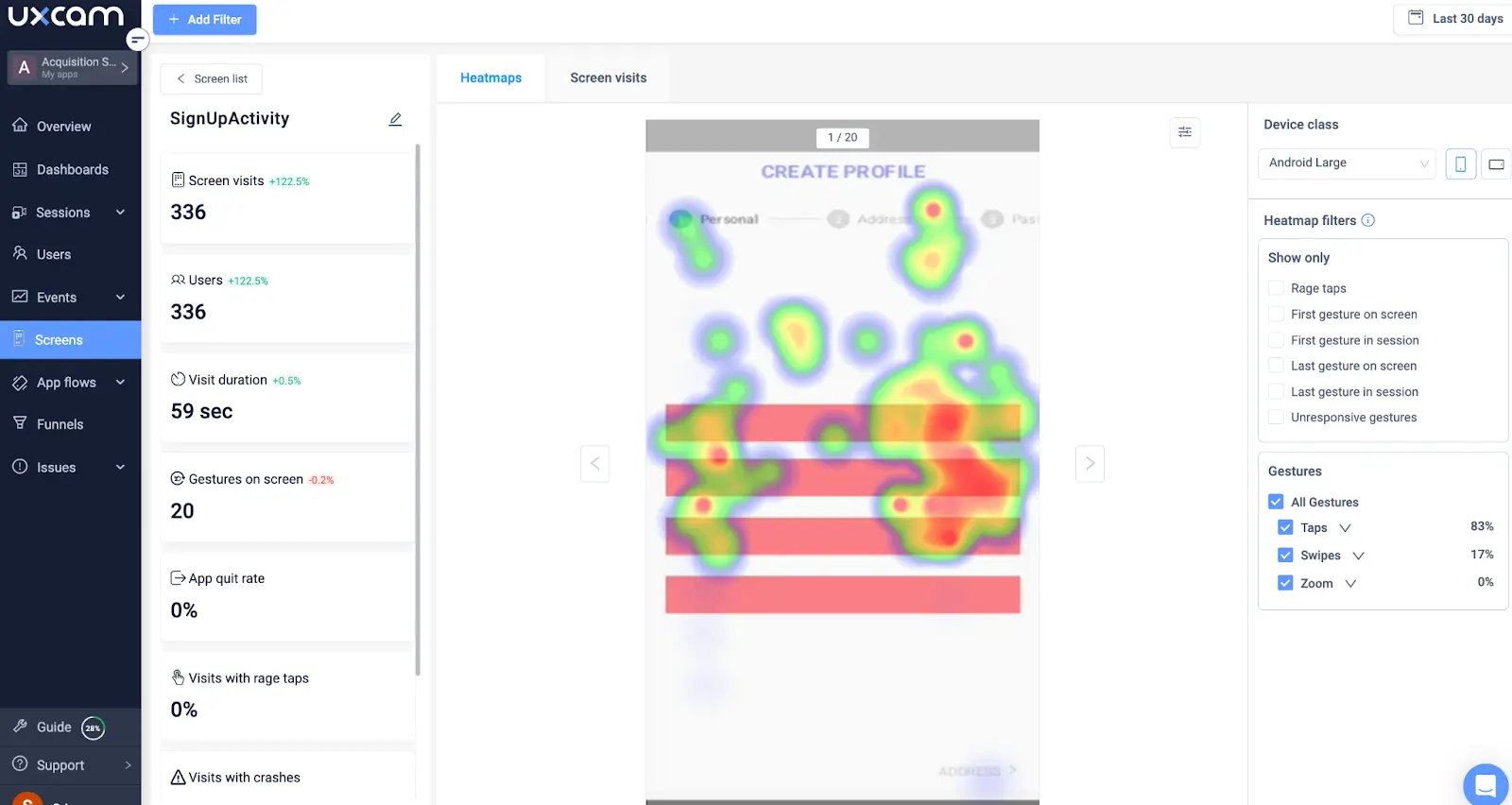 Este software de flujo de usuarios ofrece una variedad de funciones, incluido el análisis Screen Flow, que te da una visión clara de cómo los usuarios interactúan con tu aplicación móvil y navegan por ella. También te muestra los principales problemas de UX y los puntos de abandono, que son vitales para mejorar la UX.