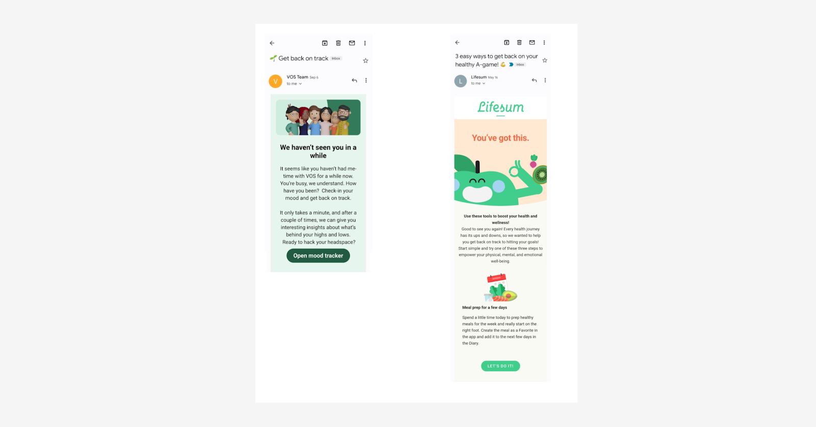 VOS envía correos electrónicos a todos los usuarios que no han estado activos durante algún tiempo, mientras que Lifesum se dirige específicamente a los que finalmente han abierto la aplicación después de un descanso
