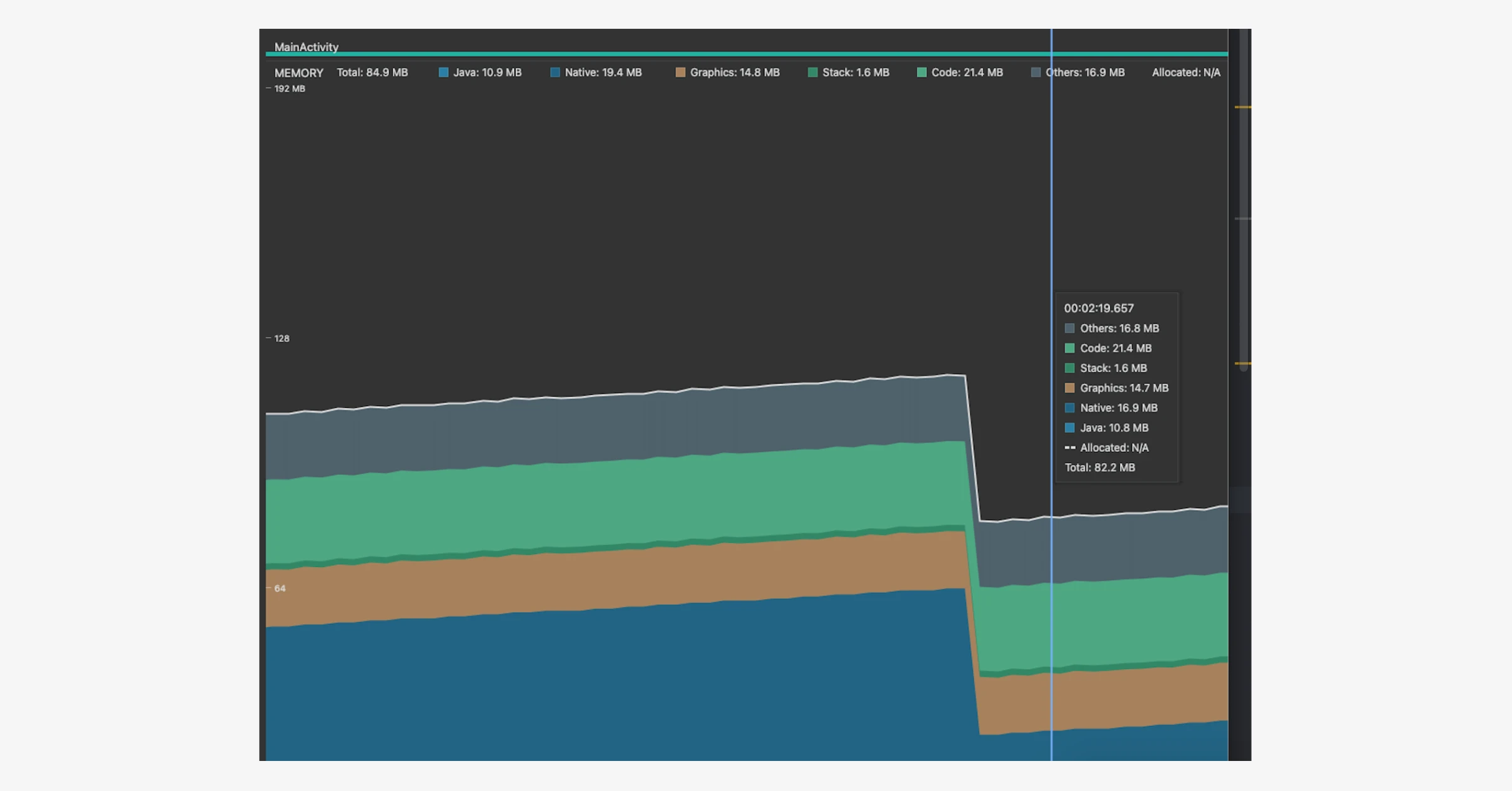 Tras realizar pruebas en dispositivos Samsung de gama media, el uso de memoria en la aplicación de prueba tras la integración de UXCam comienza en 93 MB y luego alcanza gradualmente 128 MB de memoria heap, lo que activa la recolección de basura y se restablece a 93 MB.